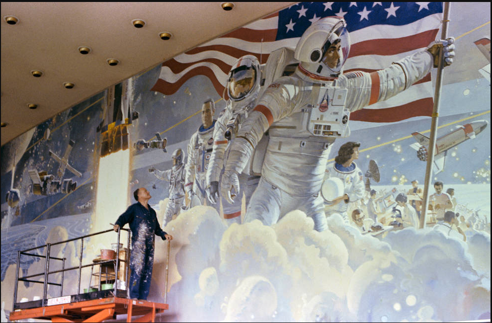 "In 1978, Christopher C. Kraft, JSC Director, commissioned McCall to paint the mural on the outside of the center’s auditorium, later named after Congressman Olin E. Teague of Texas who served on committees that oversaw NASA’s activities. In 1979, McCall spent several months at JSC painting the mural entitled Opening the Space Frontier – The Next Giant Step, illustrating NASA’s human space flight program, past, present, and future. He painted several JSC employees in the mural and used astronauts John W. Young and Judith A. Resnik as inspiration for two of the painting’s central figures. Astronaut Alan L. Bean, at the time a budding space artist, contributed by painting the astronaut pin in the mural. Dedication of the mural took place on June 19, 1979, and at the time the building housing the auditorium also housed the JSC Visitors Center, allowing the general public to view the mural." Taken from the JSC's website.